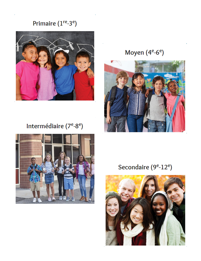 Cycle scolaire : 1re à 3e année, 4e à 6e année, 7e à 8e année, 9e à 12e année